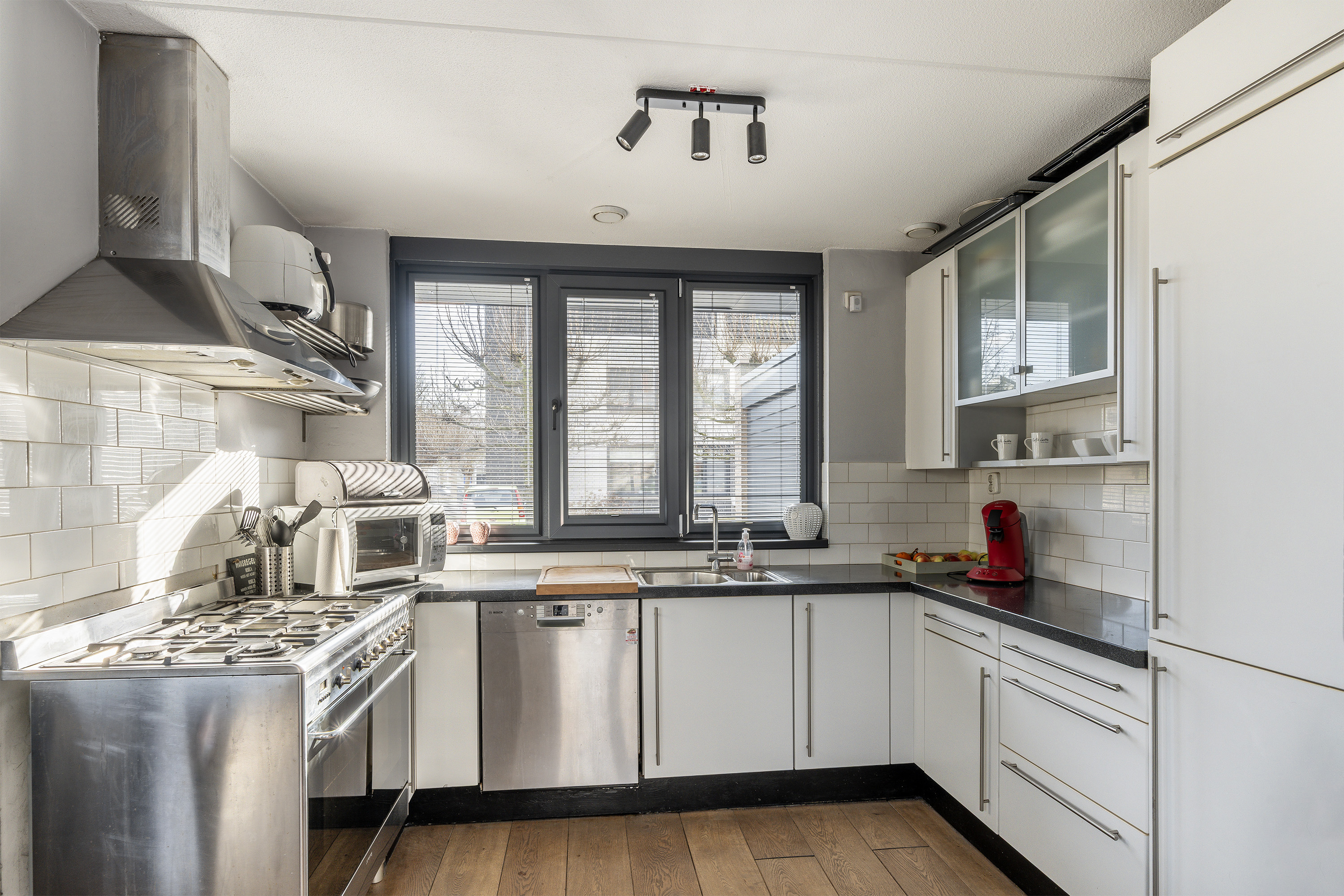 Entree, gang, hal, toilet met een handwasbakje en meterkast. Toegang naar de inpandige bergruimte van ca. 6,3m2. Royale lichte woonkamer van ca. 38m2 met een zijaanbouw, trapkast, grote uitbreide keuken en met een schuifpui voor toegang naar de tuin. De keuken (U-vorm) is uitgebreid uitgevoerd en voorzien van een 6 pits gasfornuis, rvs afzuigkap, koelkast/vriesladen, een vaatwasser en veel kastruimten. Vanuit de woonkamer is een leuk zicht op de tuin.