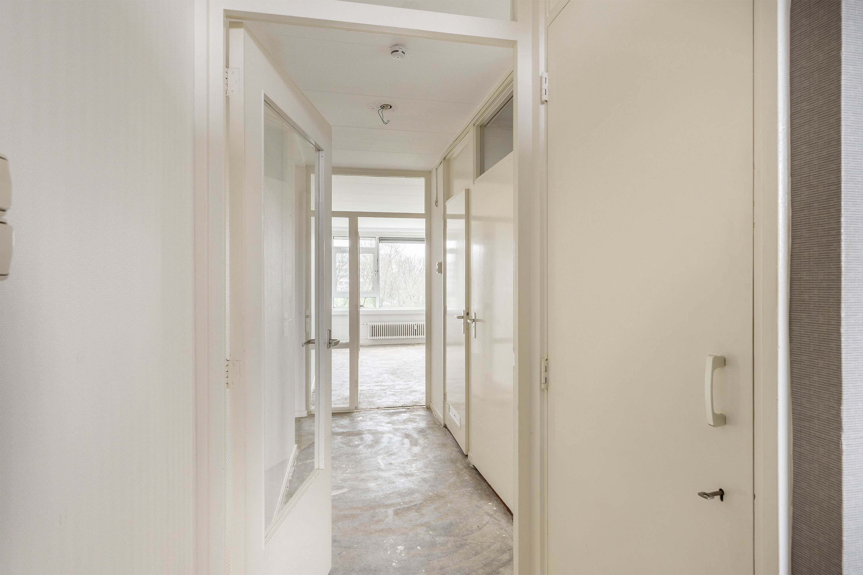 Entree appartement, hal, meterkast, aparte keuken met eenvoudig keukenblok, vaste kast en boiler. Separaat toilet. Badkamer met douche wastafel en wasmachineaansluiting. 3 ruime slaapkamers van respectievelijk 15.4m2, 10.4m2 en 12.9m2. De 'midden' slaapkamer geeft toegang tot het balkon. De woonkamer is bijna 20m2.