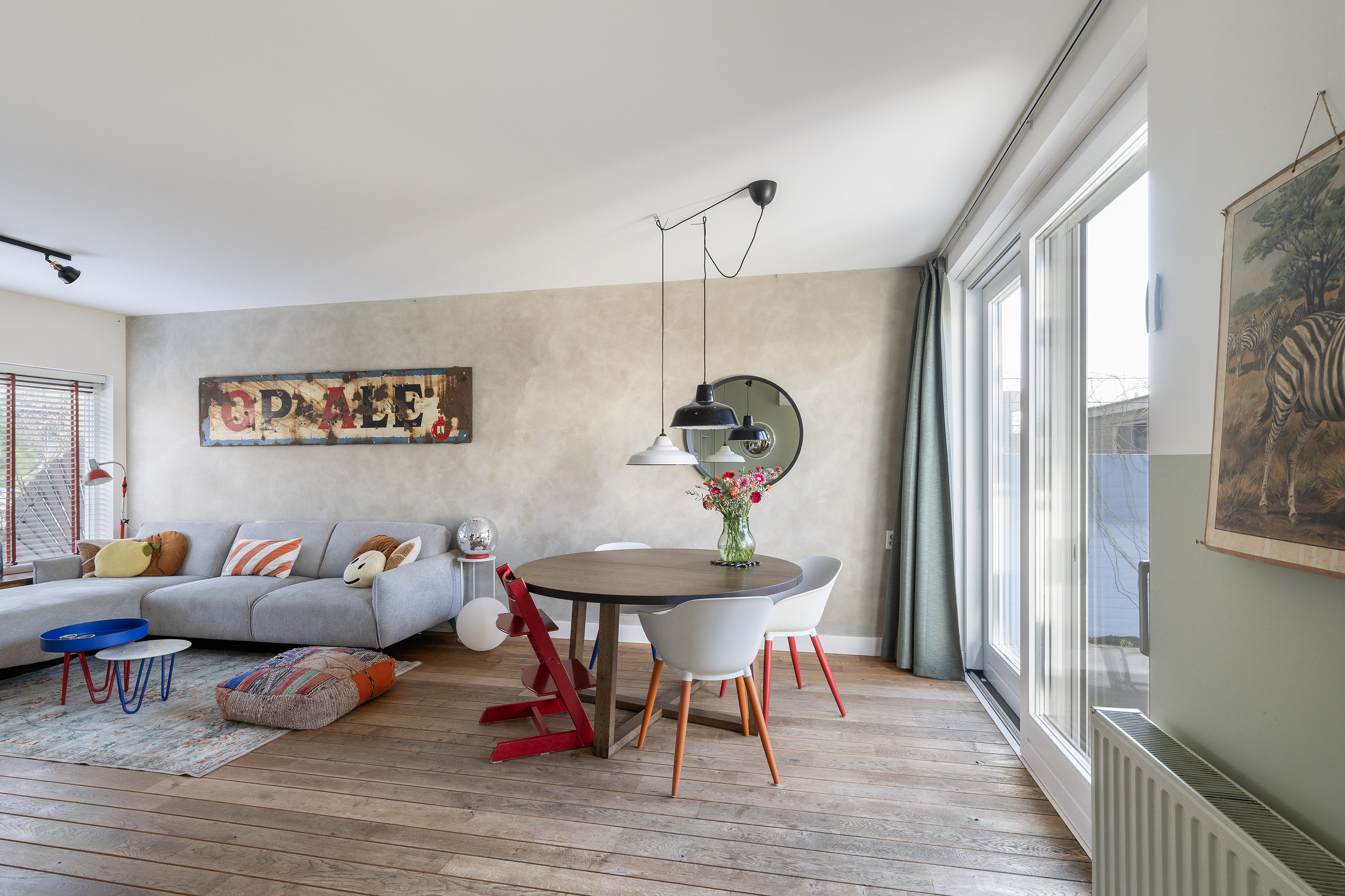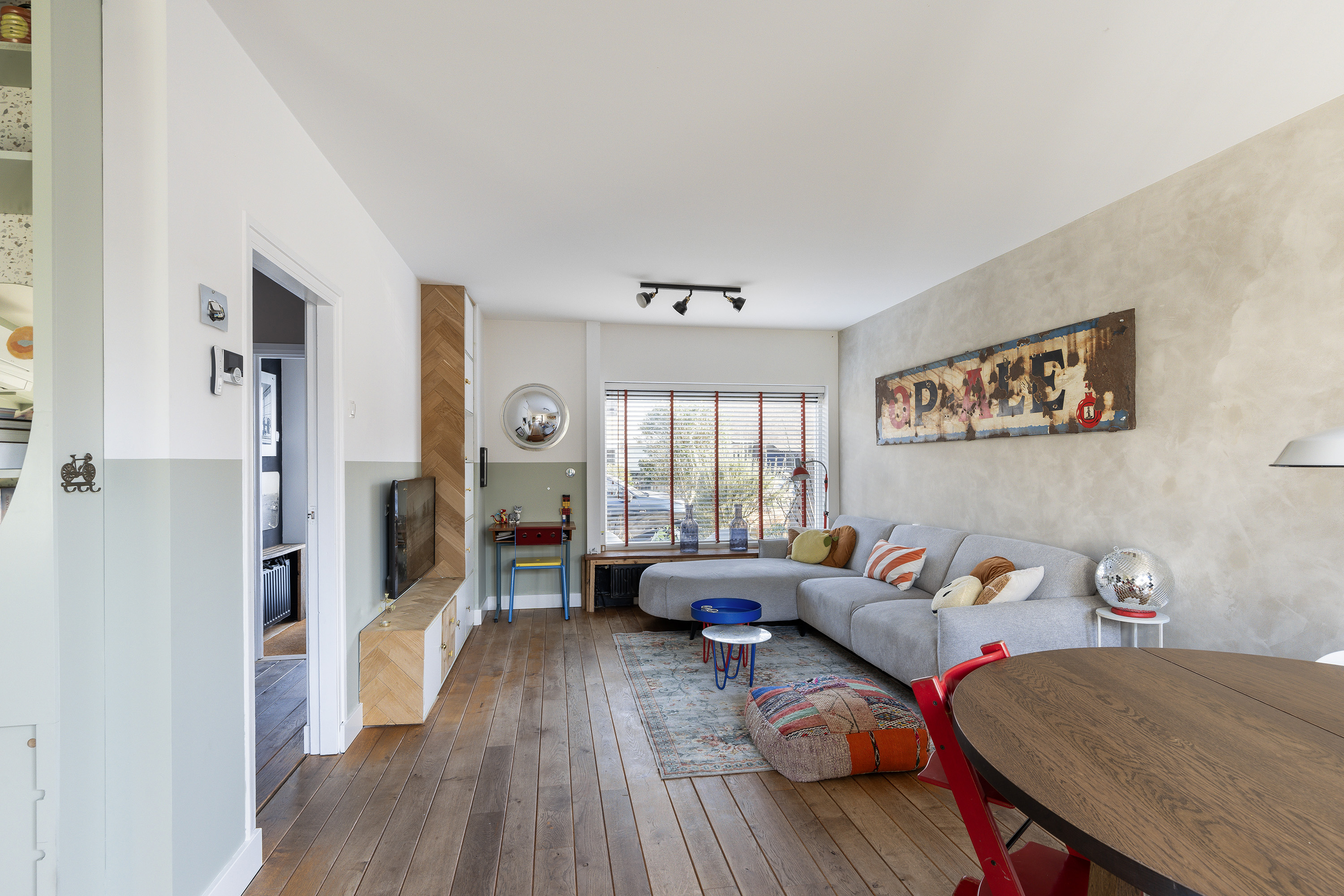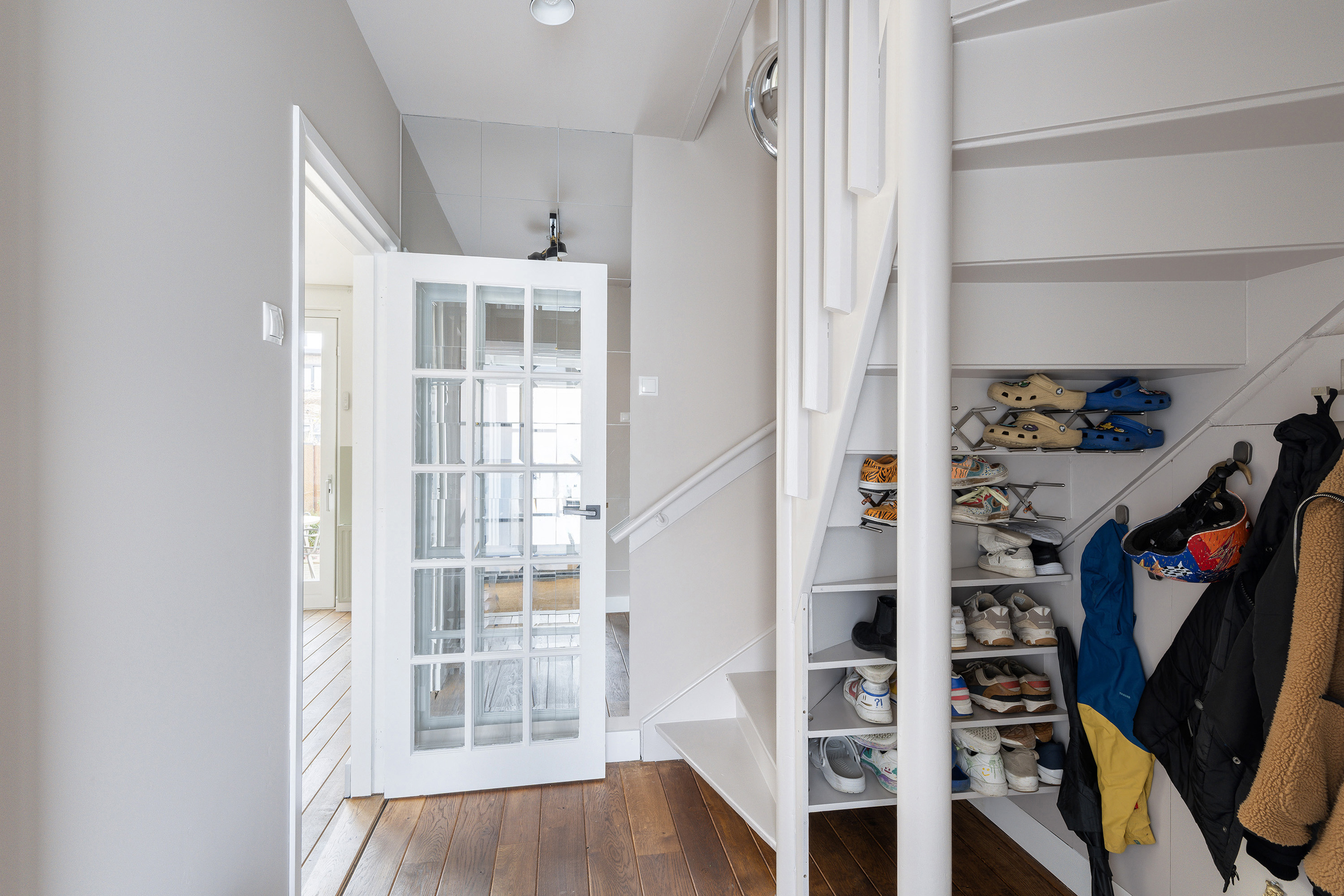Entree, hal, meterkast, modern uitgevoerd toilet, trapopgang naar de slaapverdieping. Schitterend ruime woonkamer met in het verlengde de keuken van tezamen meer dan 45m2. Het woongedeelte is voorzien van een fraaie houten vloer en geeft middels een schuifpui toegang tot de tuin. Het keuken gedeelte is voorzien van een tegelvloer en beschikt over een modern keukenblok met de navolgende apparatuur: koel/vrieskast, afzuigkap, gasfornuis en een vaatwasser. De keuken heeft vaste kasten en een kast met de wasmachine-aansluiting.