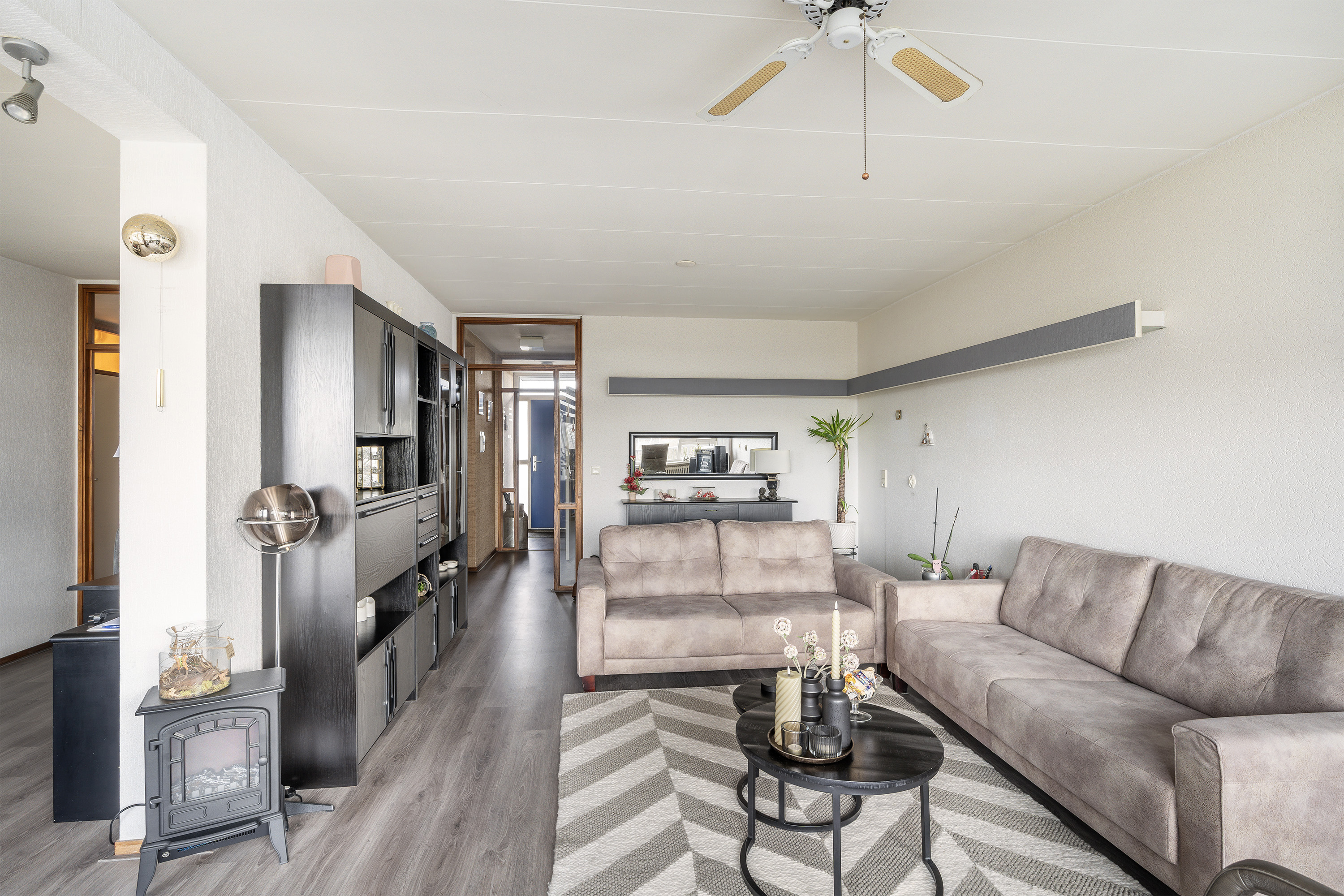 Entree, lange gang met ruime bergkast met boileropstelling. Ruime dichte keuken met een nette eenvoudige opstelling. Riante lichte woonkamer van ca. 27m2. De woonkamer is vergroot doordat de zijkamer van ca. 10m2 er bijgetrokken is. Hier is weer een aparte slaapkamer van te maken. Vanuit deze kamer is er toegang tot het balkon. Hoofdslaapkamer van ca. 12m2 gelegen aan de balkonzijde. Slaapkamer van ca. 6m2 en slaapkamer van ca. 9m2 gelegen aan de galerijzijde. Separaat toilet voorzien van fonteintje. Badkamer voorzien van wastafel, radiator, wasmachineaansluiting en een inloopdouche.