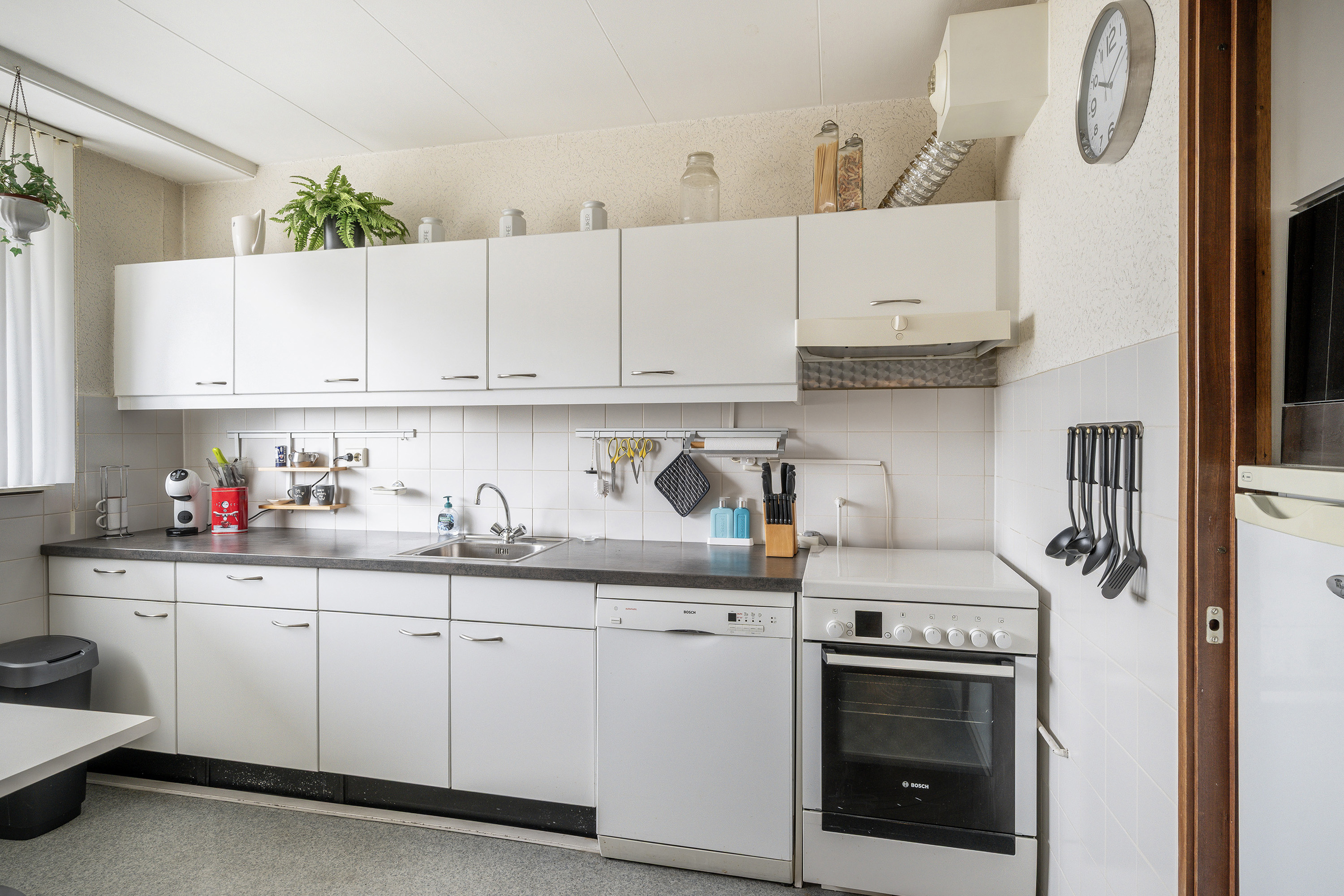 Entrance, long hallway with a spacious storage cupboard housing the boiler. Spacious closed kitchen with a neat, simple layout. Generous and bright living room of approximately 27m². The living room has been enlarged by incorporating the adjacent room of approximately 10m². This space can easily be converted back into a separate bedroom. From this room, there is access to the balcony. Master bedroom of approximately 12m² located on the balcony side. Bedroom of approximately 6m² and bedroom of approximately 9m² located on the gallery side. Separate toilet with small sink. Bathroom equipped with washbasin, radiator, washing machine connection, and walk-in shower.