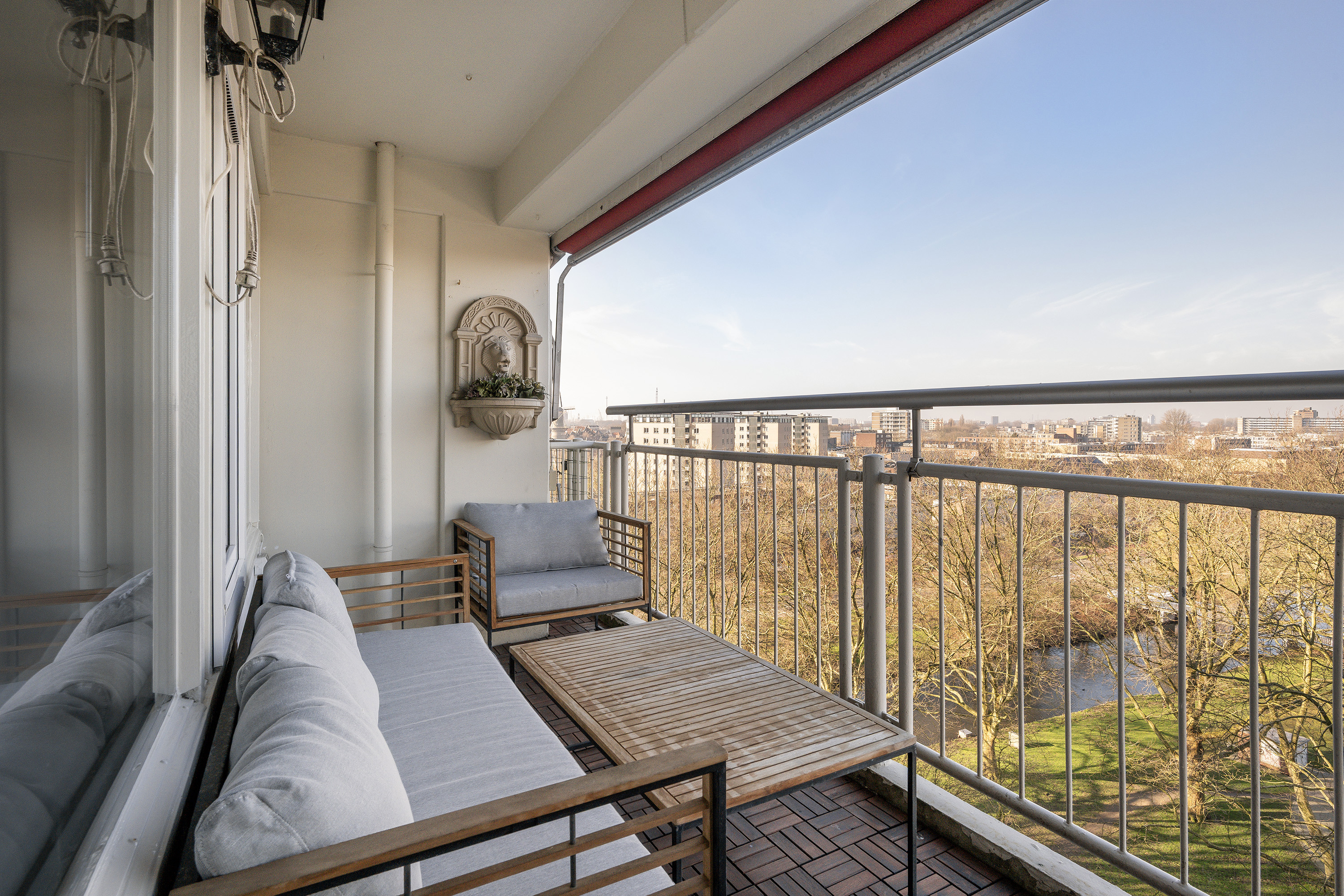 Spacious sunny balcony of approx. 8m² facing west with a magnificent view over old Schiedam with its windmills and canals.