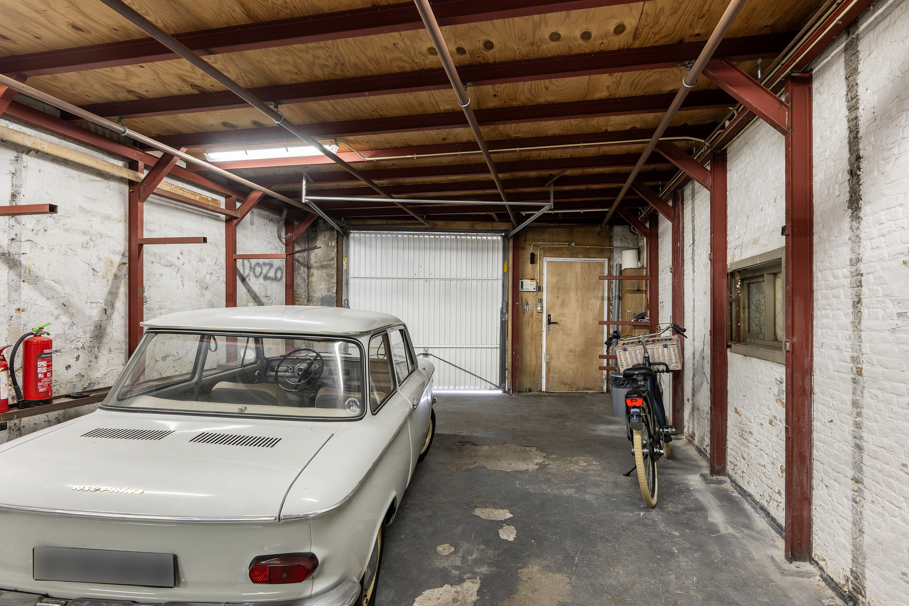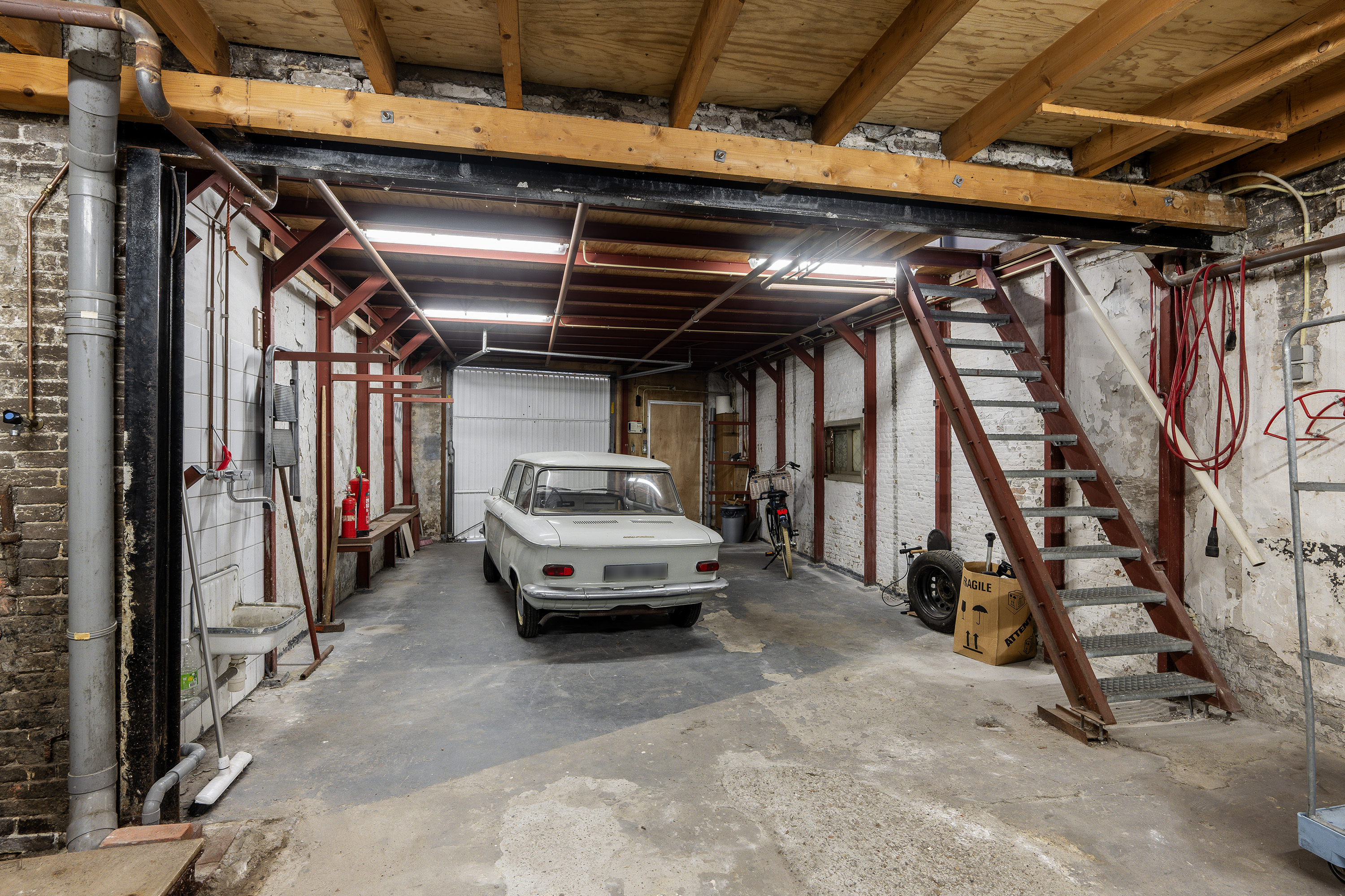 De garage is op de begane grond maar liefst 67m2 groot. Op de eerste verdieping is er nog ca. 34m2 aan gebruiksoppervlakte ingedeeld in een overloop, voorkamer en achterkamer.