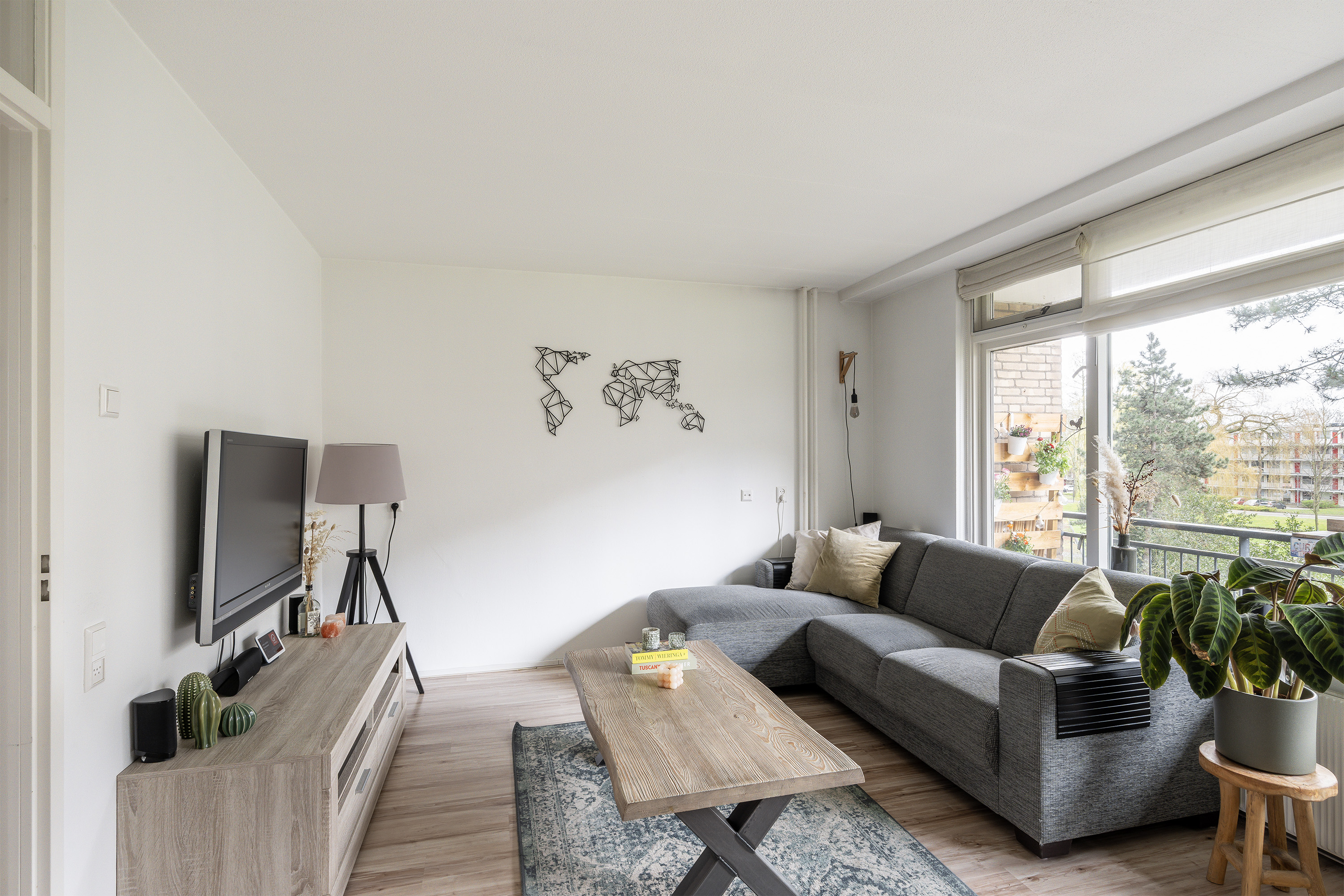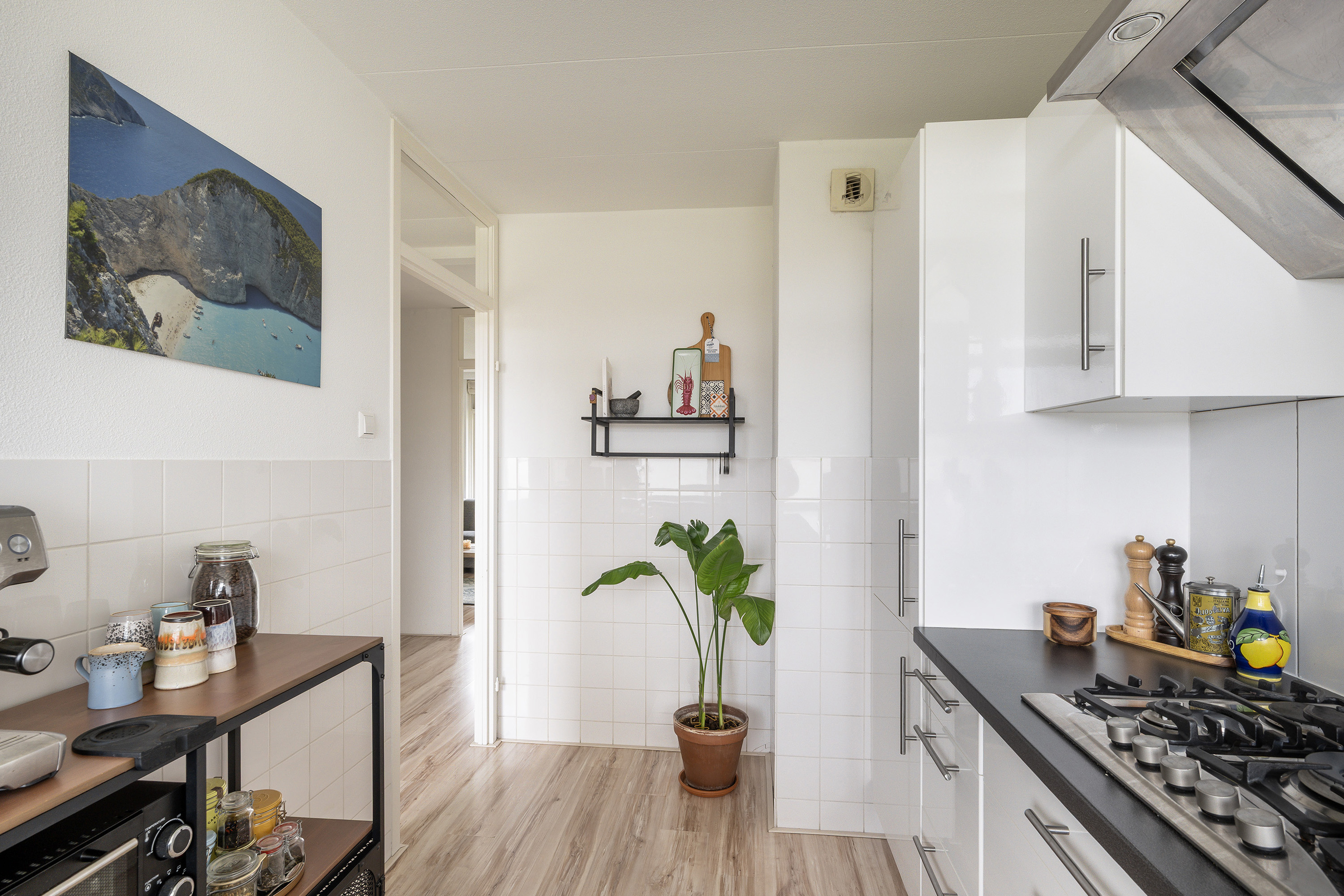 Entrance, spacious storage cupboard also housing the boiler, meter cupboard. The bathroom is equipped with a shower, toilet, washbasin cabinet, mirror cabinet, and connection for the washing machine. The generous separate kitchen is fitted with a white-fronted kitchen unit and an anthracite countertop. The kitchen includes a microwave, fridge/freezer combination, 5-burner gas hob, extractor hood, and dishwasher. Spacious bedroom of approximately 11m² with built-in wardrobe. Cozy living room of over 20m² with access to the balcony.