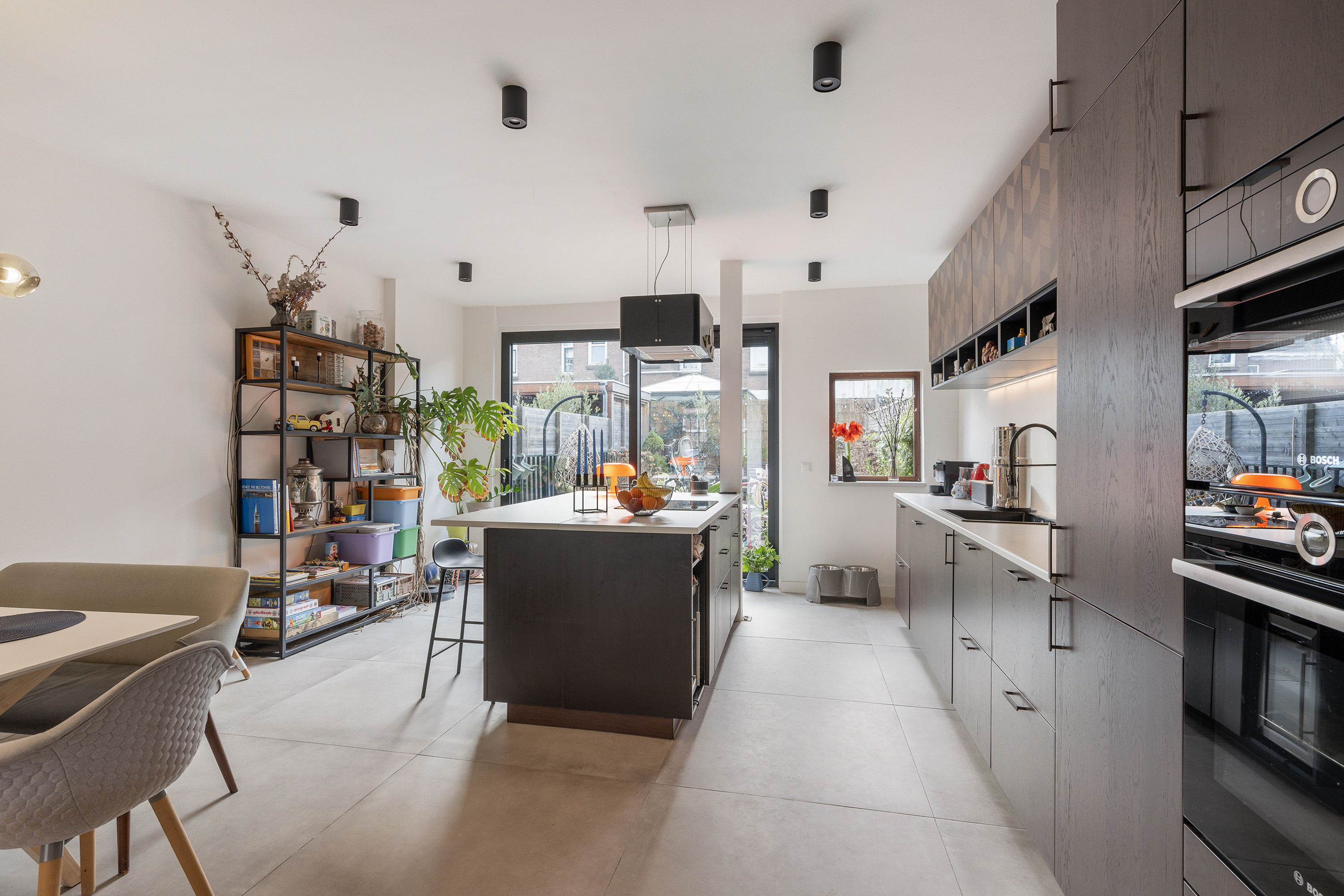 Entree, ruime hal van 9m2, trapopgang naar de 1e verdieping, trapkast en toilet. De bijzonder ruime woonkamer is fraai afgewerkt met een tegel vloer met vloerverwarming en strak gestuukte wanden en plafond. Samen met de open keuken is deze ruimte bijna 42m2 groot en via een brede schuifpui is er toegang tot de tuin. De keuken is een plaatje op zich! Veel kastruimte, veel werkblad, een kookeiland en de navolgende inbouwapparatuur: keramische kookplaat, designafzuigkap, koelkast, vriezer, oven, combimagnetron en een vaatwasser.
